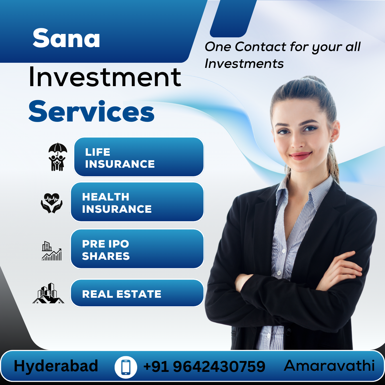 At Sana Investments, we simplify your financial journey by offering a comprehensive range of services including personal insurance, health insurance, pre-IPO shares, mutual funds, and real estate solutions.
